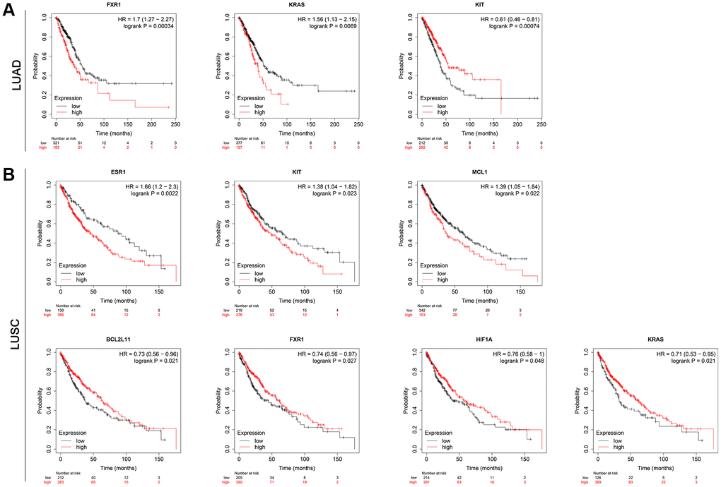 To further validate the 10 hub genes, their prognostic significance in lung cancer patients was subsequently analyzed by the Kaplan-Meier plotter online database. The survival analysis included a total of 513 LUAD patients and 501 LUSC patients. As shown in Figure 8A, among 10 hub genes, a higher expression of FXR1 and KRAS was related to a worse overall survival (OS) in LUAD patients. Interestingly, a higher KIT expression was significantly associated with better OS (p = 0.00074) in LUAD patients. However, there was no statistically significant difference in OS between high-expression and low-expression of ESR1, HIF1A, DDX3X, MAPK10, BCL2L11, FOXO1, and MCL1 in LUAD patients (Supplementary Figure 1A). For LUSC patients, increased expression of ESR1, KIT, and MCL1 predicted a poorer OS, while increased expression of BCL2L11, FXR1, HIF1A, and KRAS was associated with a favorable OS (Figure 8B). Nevertheless, there was no statistically significant difference in OS between high-expression and low-expression of DDX3X, MAPK10, and FOXO1 in LUSC patients (Supplementary Figure 1B). These data imply that high expression of the identified seven real hub genes (FXR1, KRAS, ESR1, KIT, MCL1, BCL2L11, and HIF1A) may play important roles in the carcinogenesis or progression of lung cancer.