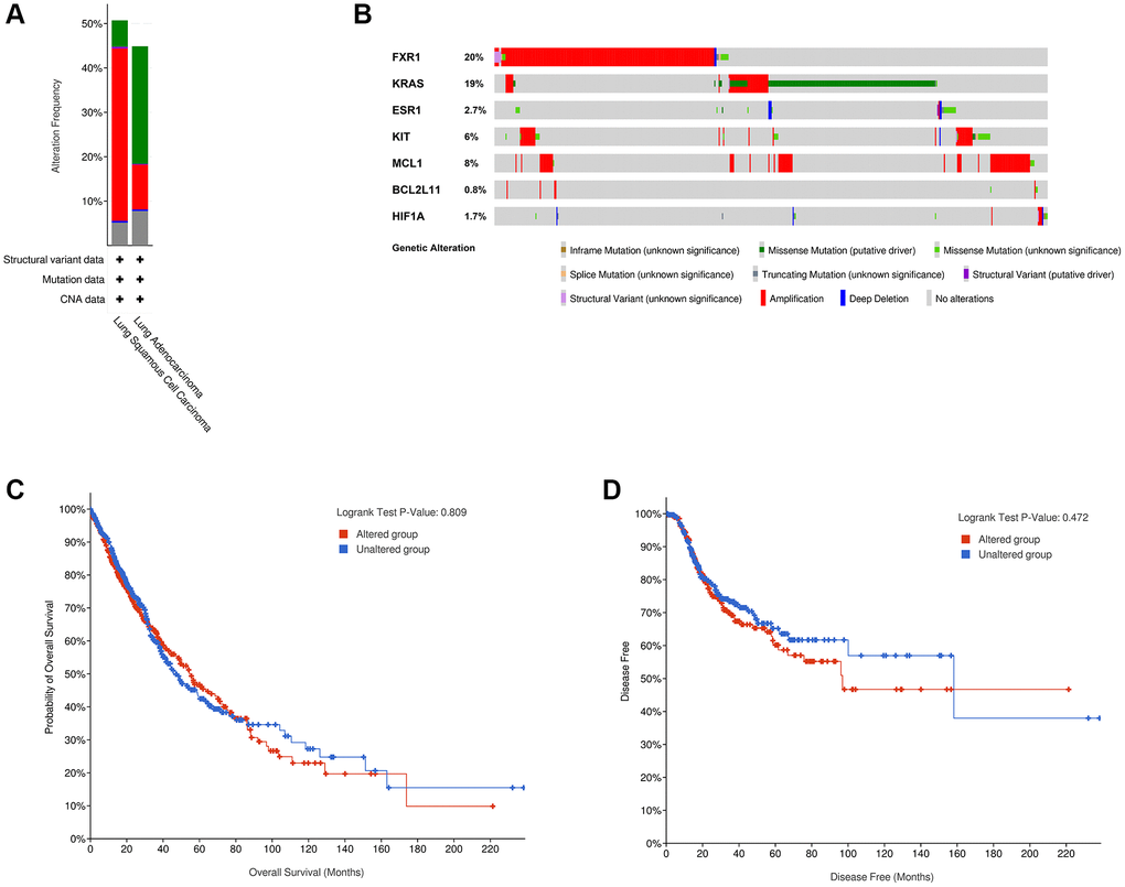 To analyze the genetic alterations of the 7 real hub genes in lung cancer in the cBioPortal online database, the LUAD (TCGA, PanCancer Atlas) and LUSC (TCGA, PanCancer Atlas) databases were used. Results showed that the percentages of genetic alterations in the two datasets were 44.88% (254/566) and 50.72% (247/487), respectively (Figure 9A). The predominant alterations were mutations for LUAD, however, for LUSC, the predominant alterations were amplifications instead of mutations (Figure 9A). Specific to lung cancer, the alteration frequency of the seven hub genes was 20% for FXR1, 19% for KRAS, 2.7% for ESR1, 6% for KIT, 8% for MCL1, 0.8% for BCL2L11, and 1.7% for HIF1A (Figure 9B). Besides, the analysis of the correlation between cases with hub gene alterations and survival outcomes was also performed. However, results showed that cases with hub gene alterations were not statistically significant (p = 0.809 for OS and p = 0.472 for disease-free survival) (Figure 9C, 9D).