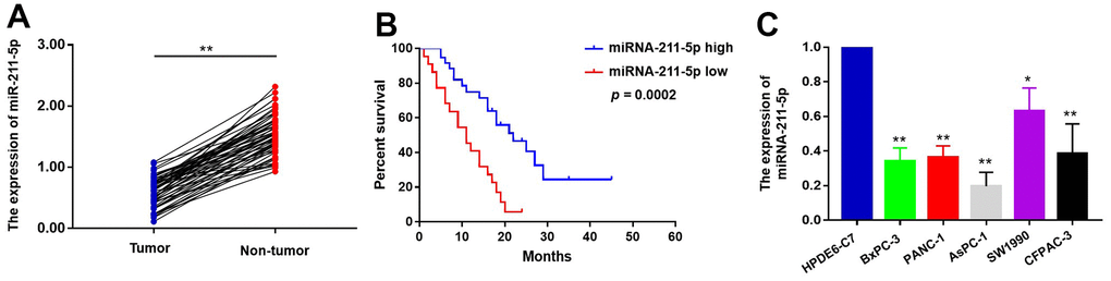 The expression levels of miR-211-5p exhibited a significant reduction in both pancreatic cancer (PC) tissues and cells