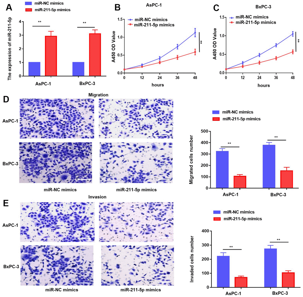The observed expression pattern and potential clinical significance of miR-211-5p indicate its possible inhibitory role in PC. To explore the impact of miR-211-5p on PC cells, we introduced miR-NC mimics and miR-211-5p mimics into PC cells through transfection. The qRT-PCR assay demonstrated a notable increase in the levels of miR-211-5p in both AsPC-1 and BxPC-3 cells (Figure 2A). Moreover, the proliferation ability of PC cells was assessed using the CCK-8 assay. Our findings indicated that the enhanced the levels of miR-211-5p exerted a substantial suppressive effect on cellular proliferation in both AsPC-1 and BxPC-3 cell lines (Figure 2B, 2C). Similarly, transwell assay demonstrated that cell metastasis was inhibited by the upregulation of miR-211-5p in AsPC-1 and BxPC-3 cells (Figure 2D, 2E). Our findings suggested that miR-211-5p exerted a suppressive effect on the cellular proliferation and metastasis of PC.