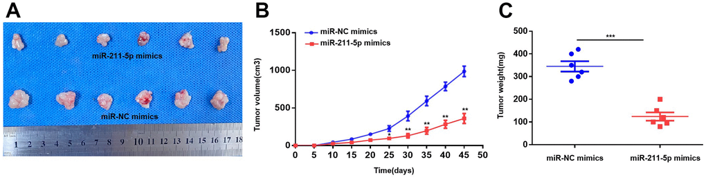 In vivo, the upregulation of miR-211-5p resulted in the suppression of tumor development