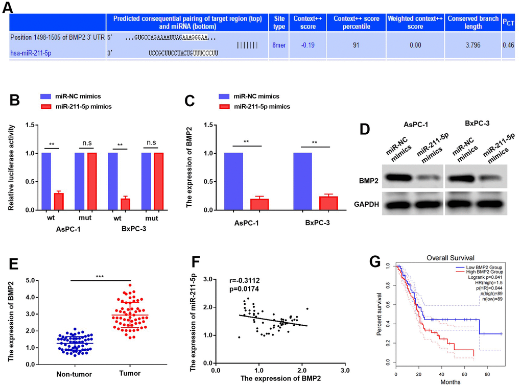 In summary, our results indicate that the functionality of BMP2 in PC cells is directly affected by miR-211-5p through targeted regulation. Interestingly, we found that their expression levels in PC tissues were negatively correlated. Reduced expression of miR-211-5p was associated with a decrease in survival time among PC patients. Furthermore, rescue experiments demonstrated that the progression of PC is facilitated by miR-211-5p specifically targeting BMP2. These findings suggest that targeting miR-211-5p could be a promising approach for future therapeutic interventions in PC.