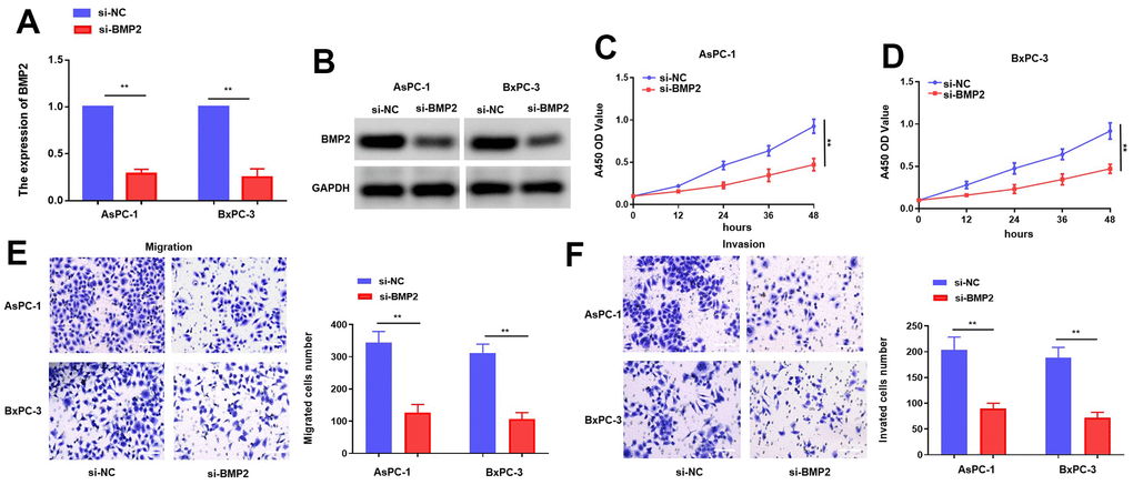 Given the well-established oncogenic role of BMP2, our study aims to validate its functional significance in PC cells. The efficiency of BMP2 siRNAs in suppressing gene expression was evaluated in AsPC-1 and BxPC-3 cells through transfection, followed by analysis using qRT-PCR and western blotting [17]. The transfection of si-BMP2 resulted in a notable decrease in the levels of BMP2 in AsPC-1 and BxPC-3 cells (Figure 5A, 5B). Moreover, we further investigated the effects of si-BMP2 on the proliferative and metastatic potential of PC. The outcomes obtained from the CCK-8 assay revealed a notable reduction in proliferation rates for both AsPC-1 and BxPC-3 cell lines transfection with si-BMP2 (Figure 5C, 5D). Furthermore, the transwell assay revealed a reduction in migration activity of AsPC-1 and BxPC-3 cells following si-BMP2 transfection when compared to the control group. (Figure 5E, 5F). The combined results of our investigation suggest that the suppression of BMP2 activity leads to a decrease in both growth and metastasis.