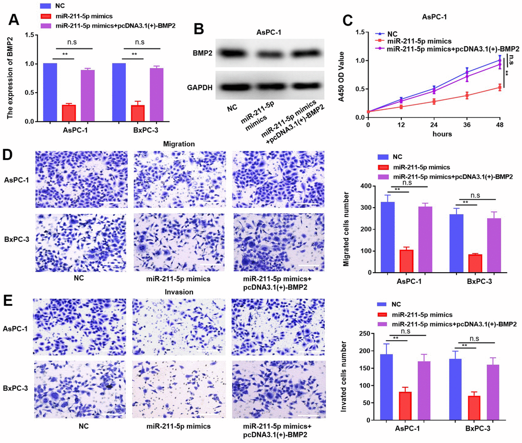 To elucidate the pivotal role of BMP2 in orchestrating regulation of miR-211-5p, we transfected miR-211-5p mimics or miR-NC mimics into PC cells together with pcDNA 3.1(+)–BMP2 through transfection. The results obtained from qRT-PCR and western blotting revealed a significant reduction in the abundance of BMP2 caused by miR-211-5p, which was partly reversed by BMP2 (Figure 6A, 6B). The CCK-8 assay revealed that the inhibitory impact of miR-211-5p on cellular proliferation in AsPC-1 and BxPC-3 cells was counteracted by BMP2 overexpression (Figure 6C). Additionally, the transwell assay also revealed that BMP2 upregulation attenuated the inhibitory effect of miR-211-5p on cellular metastasis in AsPC-1 and BxPC-3 cells (Figure 6D, 6E). Our findings suggest that the modulation of BMP2 plays a significant role in mediating the regulatory effects of miR-211-5p on the proliferative and metastatic of PC cells.