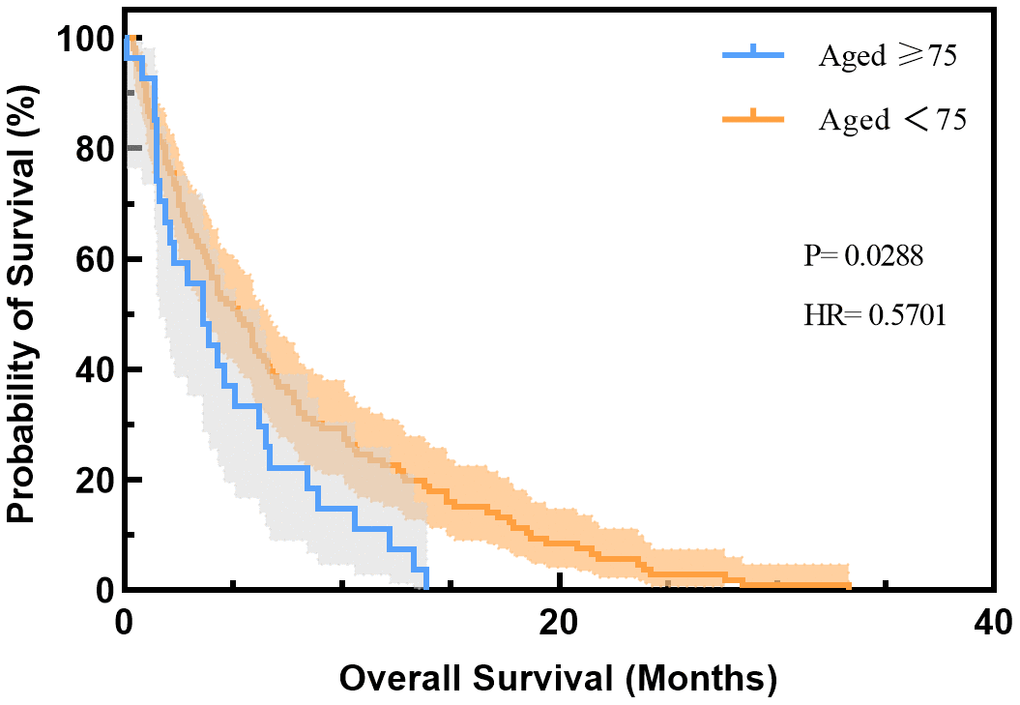 OS data were available for 133 of 336 NSCLC patients, 27 of whom were aged ≥ 75 years. The results of the univariate analysis of median OS (mOS) based on clinical characteristics are described in Table 1. The mOS for the whole NSCLC patients treated with ICIs was 4.6 months (range 3.2 months to 6.0 months). NSCLC patients aged < 75 years had a longer OS of 5.2 months (range 3.7 months to 6.7 months), while those aged ≥ 75 years had a shorter OS of 3.6 months (range 1.9 months to 5.3 months). The univariate analysis showed that age significantly affects OS in NSCLC patients treated with ICIs (P= 0.0288) (Figure 1). In addition, ECOG PS significantly affected OS with 8.9 months, 4.6 months, and 1.9 months for patients with PS= 0, 1, and 2, respectively (P= 0.0074) (Supplementary Figure 1). No difference in OS was observed in subgroups defined by sex, tumor histology, and type of ICIs. Multivariate analysis revealed that ECOG PS was an independent risk factor for OS, with p-values of 0.032 and 0.005 for NSCLC patients with PS of 1 and 2, respectively, and hazard ratio (HR) of 1.95 (95% CI: 1.06 to 3.58) and 2.99 (95% CI: 1.40 to 6.4), respectively. Although age was insignificant (P= 0.068), the HR was 1.51 (95% CI: 0.97 to 2.35), indicating that elderly NSCLC patients using ICIs have a 1.5-fold higher risk of death than non-elderly patients.