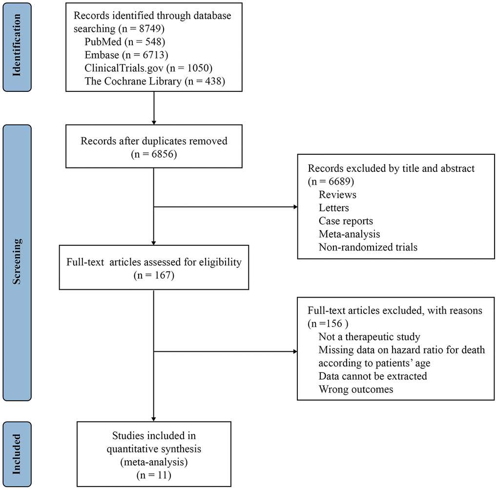 The inclusion criteria were as follows: (i) RCTs in patients with NSCLC, (ii) Studies comparing the efficacy of ICIs to non-ICIs, (iii) Subgroup analysis of OS using a HR based on the age (≥ 75 years versus < 75 years). Two reviewers (YJX and SYX) independently screened the titles and abstracts to identify the potential articles, and then assessed the eligibility of the full texts of these relevant articles.