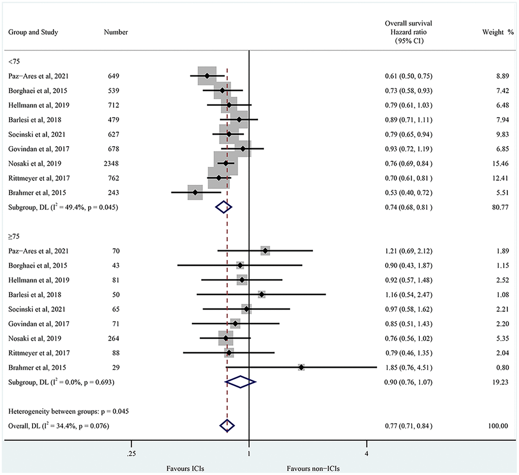 The primary outcome of this study concerns OS from RCTs comparing ICIs to non-ICIs treatments. Supplementary Figure 3A depicts the HR of each trial and the pooled result based on the random-effects model. Overall, the estimated HR is 0.75 (95% CI: 0.69 to 0.81, P < 0.001), indicating that ICIs treatment resulted in a 25% reduction in the risk of death when compared to non-ICIs treatment. However, individual trials observed significant heterogeneity (I2= 47.3%, chi-squared P= 0.041). Patients were then segregated into two age groups with a cutoff age of 75 years. For non-elderly patients, the estimated HR for OS between ICIs and chemotherapy is 0.74 (95% CI: 0.68 to 0.81) (Figure 3). Significant heterogeneity was observed among individual trials in this cohort (I2= 49.4%, chi-squared P= 0.045). Conversely, the random-effects estimate of the HR for those aged 75 or older amounts to 0.90 (95% CI 0.76 to 1.07) (Figure 3), and there was no significant heterogeneity in this group (I2= 0.0%, chi-squared P= 0.693). We used independent samples T-tests to calculate OS for NSCLC patients in the non-elderly and elderly groups. Our results concluded that there was a significant difference in efficacy between non-elderly and elderly patients (P= 0.025). In addition, the relevant factors affecting the efficacy of ICIs were summarized and presented in Supplementary Table 5.