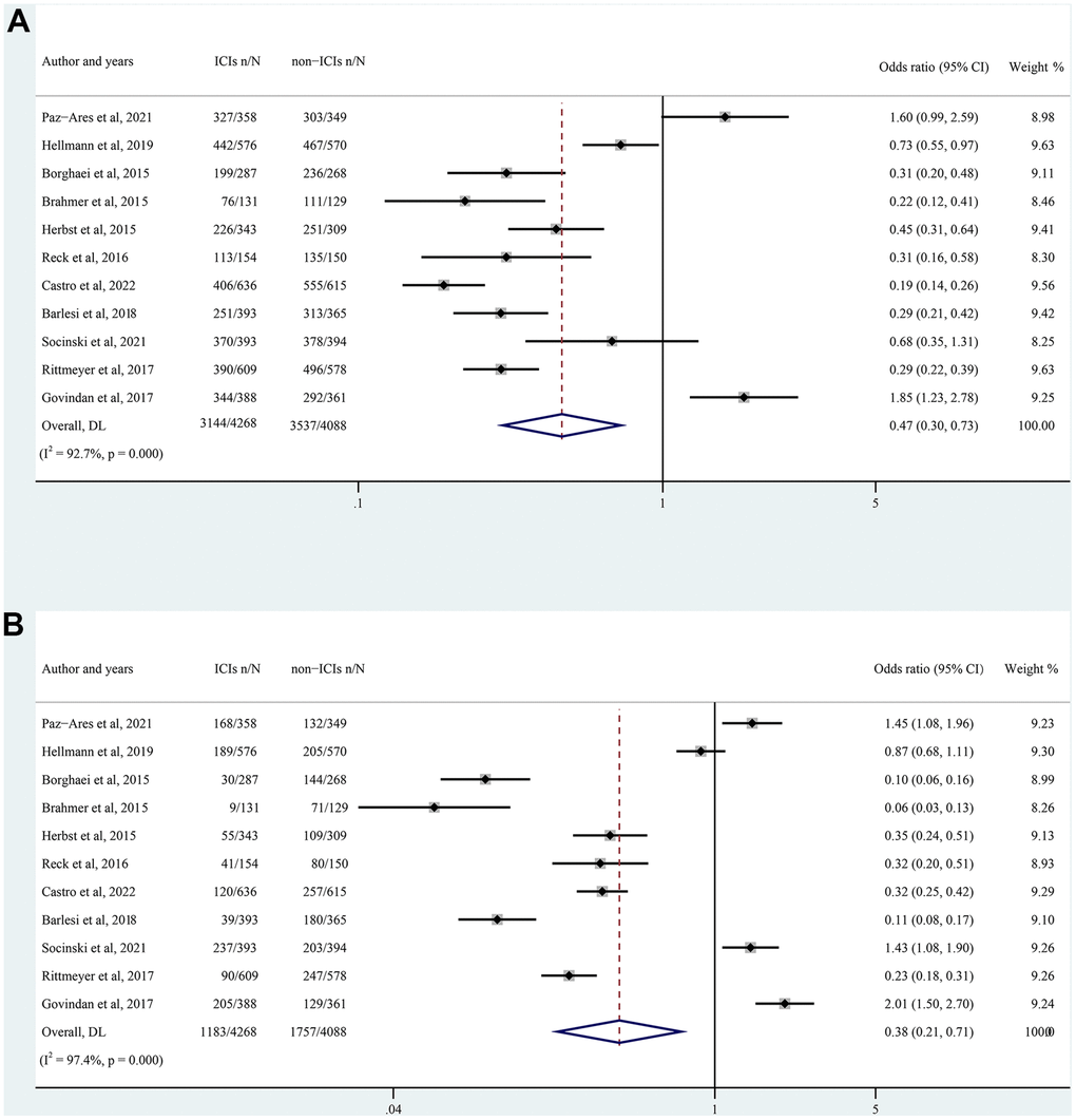 A total of 11 RCTs were included for safety analysis, including the number of patients with all-grade and high-grade TRAEs in the intervention group (ICIs group) and the control group (chemotherapy group). In terms of ICIs in NSCLC patients, there was a significantly lower incidence of all-grade TRAEs than non-ICIs (OR= 0.47; 95% CI: 0.30 to 0.73; p < 0.0001) (Figure 4A). Compared with non-ICIs, ICIs result in a lower incidence of high-grade TRAEs (OR= 0.38; 95% CI: 0.21 to 0.71; p < 0.0001) (Figure 4B). We next performed subgroup analysis, given the significant heterogeneity observed (I2= 92.7% and 97.4%, respectively).
