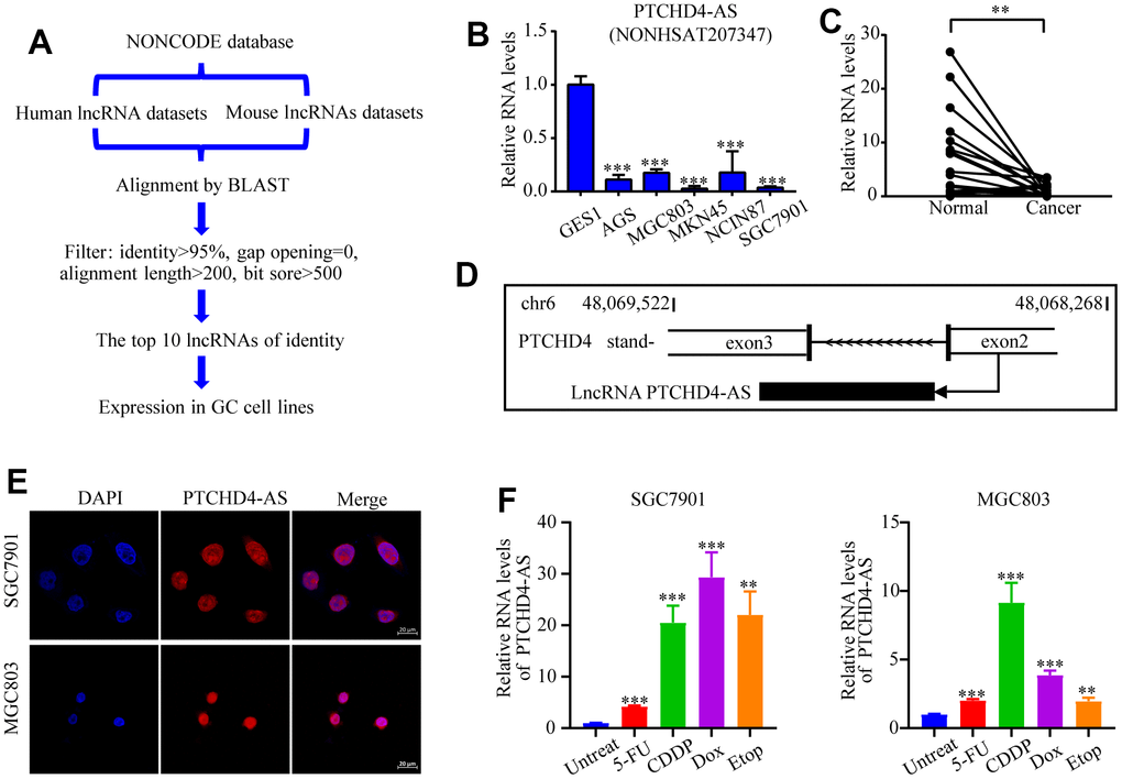 Using RT-qPCR, we analyzed the levels of expression of these non-coding RNA in GC cell lines (Supplementary Figure 1A). We found that lncRNA NONHSAT207347, exhibited a notably low expression in many GC cell lines (AGS, SGC7901, MGC803, MKN45, and NCI-N87) as compared to the normal gastric epithelial cell line GES-1 (Figure 1B). Moreover, its expression was also reduced in GC tissues compared to paired normal tissues (Figure 1C). This lncRNA (NONHSAT207347) is a transcript located on chromosome 6 (48,068,268-48069522, GRCh38/hg38) and transcribed from the antisense strand of the protein-coding gene PTCHD4. Therefore, it was named PTCHD4-AS (Figure 1D). RACE assay confirmed its length is about 500 nucleotides (Supplementary Figure 1B), and CPAT [31] predicted that PTCHD4-AS does not encode a protein (Supplementary Figure 1C). Using FISH analysis and cytoplasmic and nuclear RNA fractionation assay, we observed that PTCHD4-AS is mainly localized in the nucleus (Figure 1E and Supplementary Figure 1D). Interestingly, we observed that the expression of PTCHD4-AS was significantly induced by various DNA-damaging agents (5-fluorouracil, cisplatin, doxorubicin, and etoposide) in GC cells (Figure 1F).