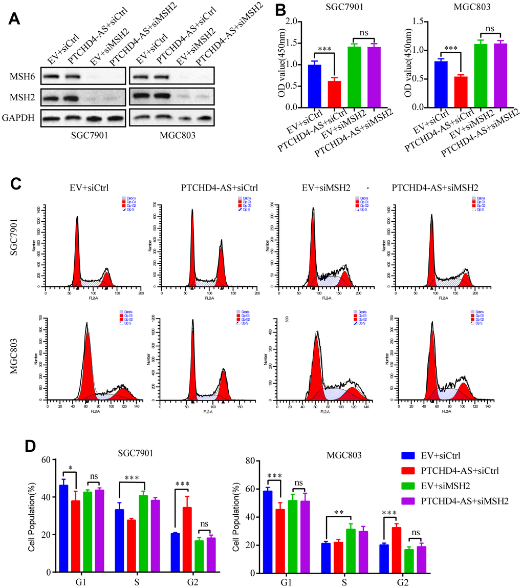 Previous studies observed that overexpression of MSH2 or MSH6 in cancer cells led to MMR-dependent activation of DNA damage signaling and cell cycle G2/M arrest [35–37]. Moreover, it has been reported that the stability of MSH6 protein depends on its interaction with MSH2 [34]. Consequently, we postulated that the PTCHD4-AS influence the activity of the MSH2-MSH6 dimer in GC cells. Therefore, we employed small interfering RNAs (siRNAs) to suppress the production of MSH2 in GC cells. It was observed that the downregulation of MSH2 led to a considerable decline in the protein expression of MSH6 (Figure 4A). Furthermore, this downregulation of MSH2 counteracted the inhibitory impact of PTCHD4-AS on the proliferation of GC cells (Figure 4B). Additionally, it was observed that the downregulation of MSH2 resulted in the reversal of the G2/M phase arrest caused by the overexpression of PTCHD4-AS (Figure 4C, 4D), suggesting that the tumor suppressive impact of PTCHD4-AS is facilitated by its interaction with the MSH2-MSH6 dimer.