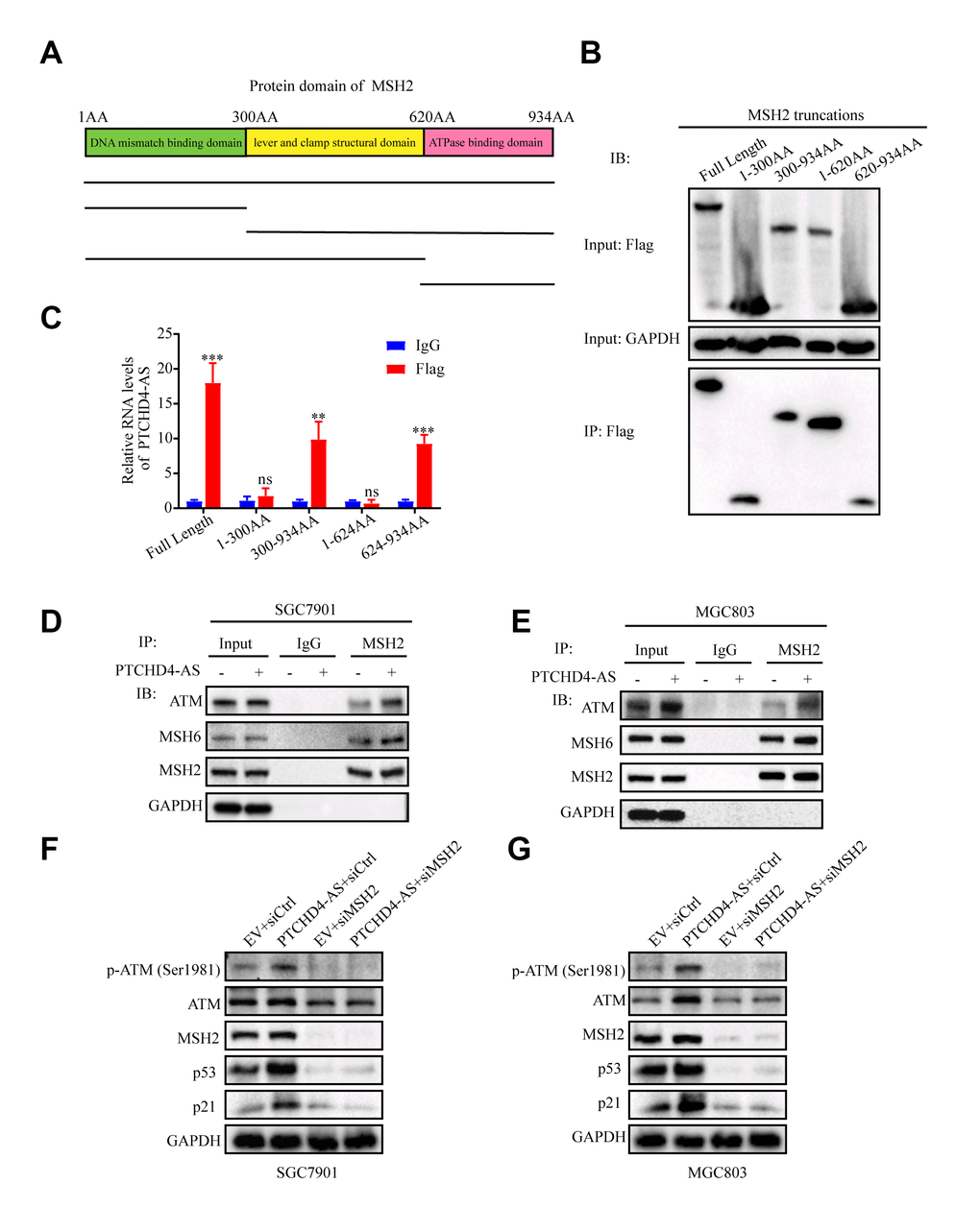 Our findings demonstrated that the PTCHD4-AS molecule effectively suppressed the proliferation of GC cells through its interaction with the MSH2-MSH6 dimer. Nevertheless, the impact of PTCHD4-AS on the protein expression of MSH2 and MSH6 was not seen (Figure 4A), indicating that it might functionally regulate it. In light of the fact that the MSH2-MSH6 dimer is assembled through the ATPase domain of MSH2, we aimed to examine the potential interaction between PTCHD4-AS and this specific domain. The MSH2 protein encompasses three distinct domains in sequential order from its N-terminal to C-terminal regions. These domains include the N-terminal DNA mismatch repair binding domain (amino acids 1 to 300), the lever and clamp structural domain (amino acids 300 to 620), and the ATPase structural domain (amino acids 620 to 934) (54). We generated truncated MSH2 constructs according to these domains (Figure 5A) and performed flag-RIP assay using anti-flag antibody. We found that PTCHD4-AS bound to the ATPase domain of MSH2 (Figure 5B, 5C), indicating that it may facilitate the MSH2-MSH6 dimerization.