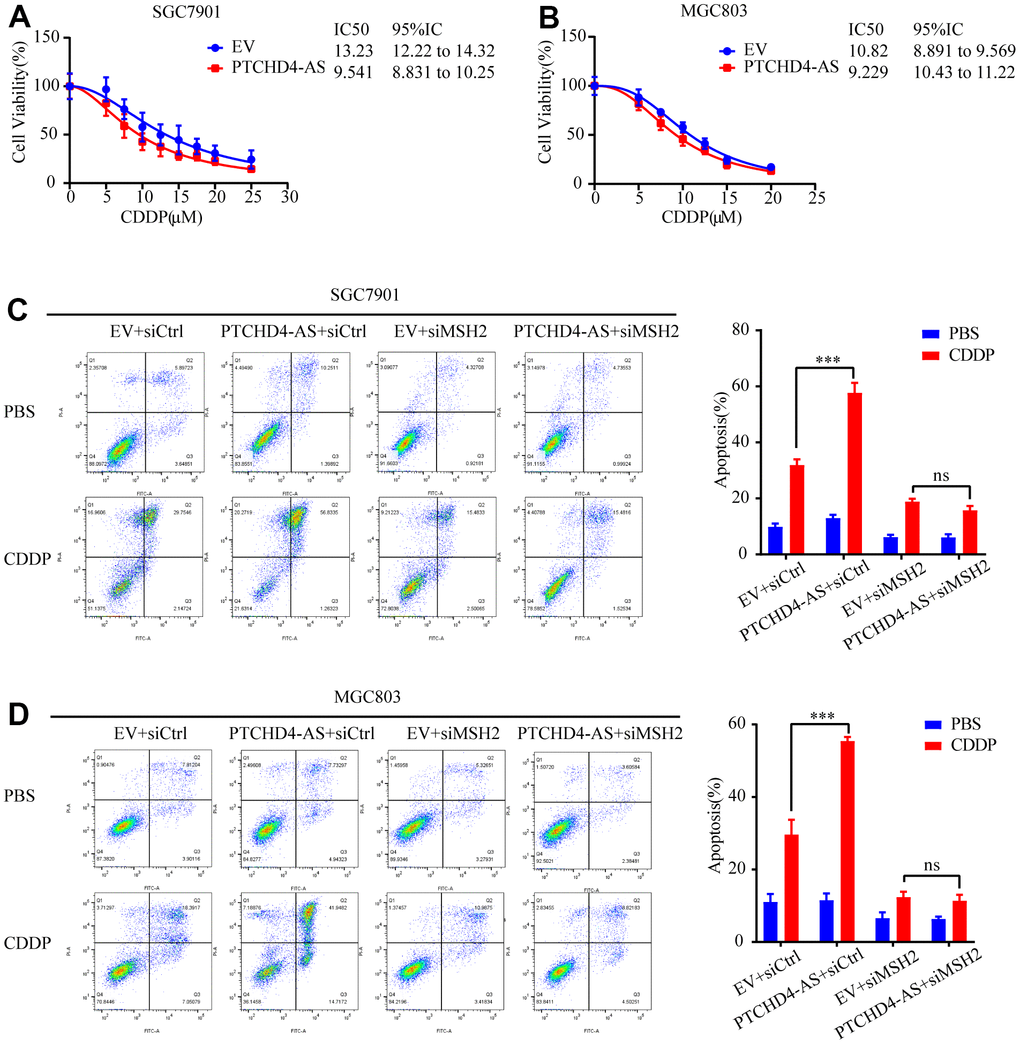 Cisplatin (CDDP) is one of the most commonly used first-line chemotherapy drugs for GC [41]. However, its efficacy is often limited by drug resistance, which has been associated with impaired MMR function [42, 43]. Hence, we assessed the potential effect of PTCHD4-AS on the cellular response of GC cells towards cisplatin. It was observed that the overexpression of PTCHD4-AS resulted in decreased IC50 of CDDP in both SGC7901 and MGC803 cells (Figure 6A, 6B). Furthermore, we determined that the overexpression of PTCHD4-AS alone did not substantially induce apoptosis in GC cells. However, it did improve the apoptotic effect of CDDP. The observed effect was reversed after MSH2 knockdown (Figure 6C, 6D). These findings suggest that PTCHD4-AS enhances the sensitivity to CDDP via the MSH2-MSH6 dimer.