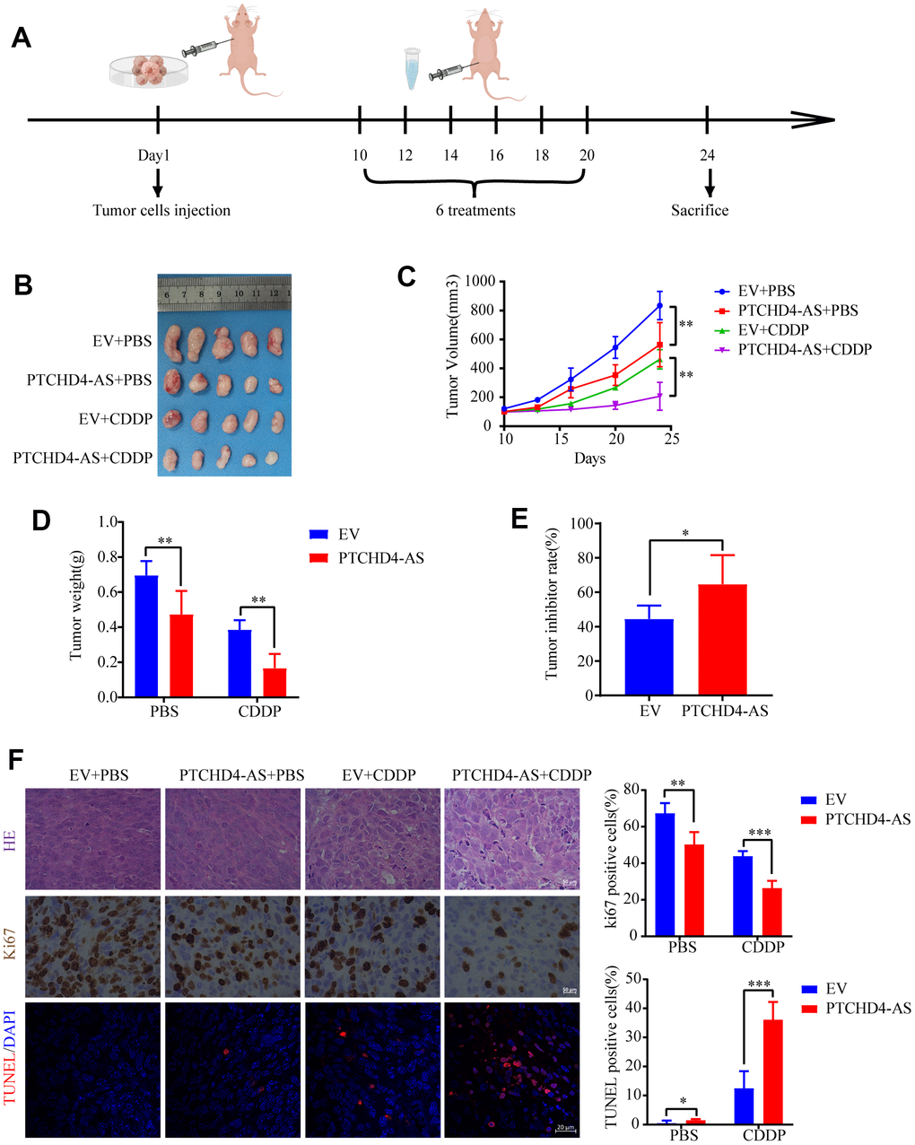 Female BALB/c nude mice aged 3-4 weeks were purchased from Huafukang Biotechnology (Beijing, China) and acclimatized in the SPF-grade standard animal house of the Fifth Affiliated Hospital of Zhengzhou University for one week. About 5×106 SGC7901 cells stably expressing PTCHD4-AS and empty vector were injected subcutaneously into the back of the mice. Upon attaining a tumor volume of around 100 mm3, the mice were randomly allocated EV+PBS group, PTCHD4-AS+PBS group, EV+CDDP group, and PTCHD4-AS+CDDP group (n=5). CDDP (4 mg/kg) or an equivalent volume of PBS was injected intraperitoneally every two days six times. The tumor length (a) and width (b) were measured twice a week using a caliper, and the tumor volume (V) was calculated as V(mm3) =1/2ab2. On day 24, mice were euthanized using anesthesia, and tumors were excised, weighed, and fixed in 4% paraformaldehyde (Biosharp, China).