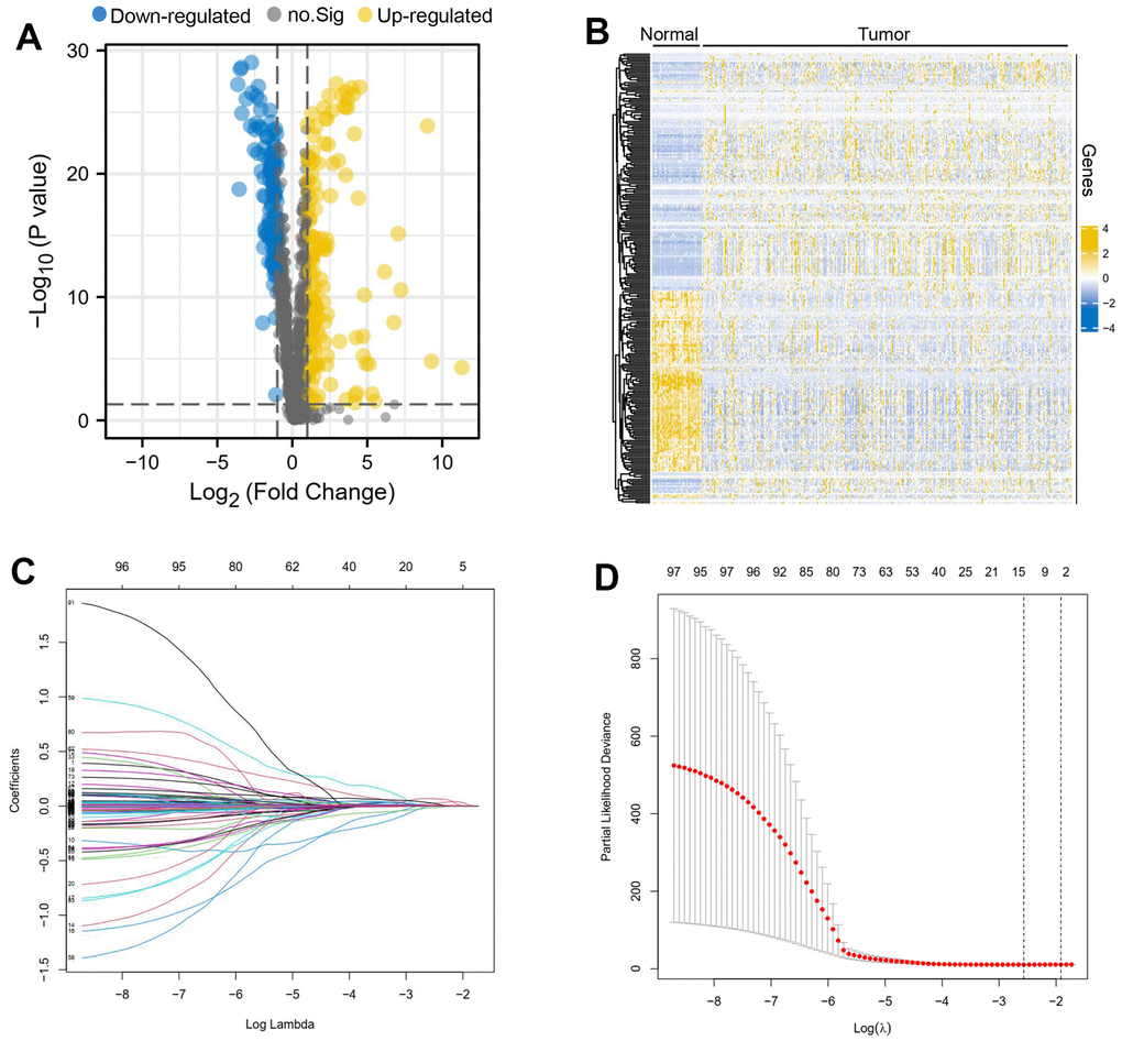 Univariate Cox regression was used to filter prognostic genes associated with patients’ overall survival (OS), and genes that met the criteria were further entered into the LASSO regression model for selection of significant genes among these genes, which were done by the survival package and the caret package respectively. A p-value less than 0.05 was defined as statistically significant in the univariate Cox regression. The best model variable was obtained by taking the minimum value of Lambda in the LASSO regression. The lambda.min is the optimal value of λ found during the cross-validation process, used to minimize prediction error, rather than just being the smallest possible value of λ.