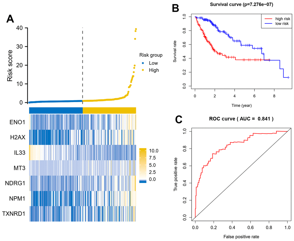As a hub gene of signature identified by PPI network, ENO1 is overexpressed in 70% of human cancers and is associated with poor cancer prognosis, converts 2-phosphoglycerate to phosphoenolpyruvate, plays an important role in the glycolytic pathway and the Warburg effect in cancer cells [19, 20]. High expression of ENO1 increased the risk score and the likelihood of poor prognosis, act as a biomarker in patients with hepatocellular carcinoma, and may be a favorable candidate for targeted treatment [21]. NDRG1, one member of NDR- and an α/β hydrolase-fold region family [22]. Both NDRG1 and ENO1 are closely related to glycolysis and carcinogenesis. Studies have shown that NDRG1 play important roles in tumor invasion and metastasis [23]. Compared to healthy controls, NDRG1 expression is upregulated in HCC patients and is associated with poorer prognosis and histological grade [24, 25]. NPM1, abundant nucleolar proteins that often shuttle between the nucleolus and the nucleoplasm or cytoplasm, is involved in chromatin remodeling, genome stabilization, cell cycle progression, and apoptosis in cancer [26]. The study showed that liver cancer patients with lower levels of NPM1 have a better prognosis [27]. MT3 protects the body from DNA damage, and H2AX is a biomarker of DNA damage [28, 29]. As one of the major REDOX regulators, TXNRD1 is associated with tumor aggressiveness and poor prognosis [30]. Patients with high expression of IL-33 in their tumors had higher survival rates. These indicate the importance of these 7 indicators in tumor prognosis.