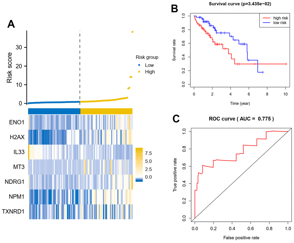 In this study, we screened seven gene biomarkers related to the prognosis of HCC from the perspective of oxidative stress, measured five targets expression (ENO1, NDRG1, NPM1, TXNRD1 and IL-33) of the seven gene biomarkers to investigate the reliability of the multi-index prediction in clinic, increasing the sensitivity and specificity of the predictive model and resulting in a significant increase in overall confidence.