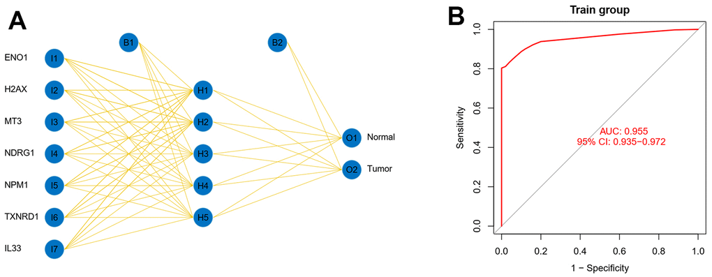 Back propagation (BP) network was used to assess the ability of the model genes to detect early-stage liver cancer. We first transformed the raw count into TPM data and calculated the genescore of the model genes based on the results of the difference analysis and the expression of the model genes in the genescore matrix, where genescore in the genescore matrix, genescore greater than the median expression value is defined as 1, and those less than the median expression value is defined as 0. Finally, we input the genescore matrix into the BP network and visualise it, and the area under the ROC curve is used to assess the predictive power.