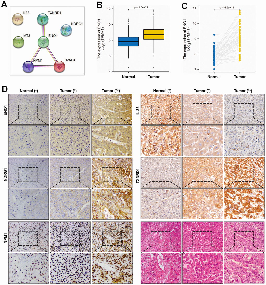 PPI network identifies ENO1 as hub gene of signature (Figure 5A). We examined the expression of ENO1 gene in hepatocellular carcinoma tissues at both transcriptomic levels and showed that ENO1 gene was significantly more highly expressed in both paired and unpaired hepatocellular carcinoma samples compared to paracellular tissues (Figure 5B, 5C). To further verify the effectiveness of ENO1, we performed the validation studies. As shown in Figure 5D, immunohistochemistry experiment was used to measure the expression of ENO1 in paracellular tissues and hepatocellular carcinoma sample. Compared with the paracellular tissues (Normal * group), the expression of ENO1 was increased in the hepatocellular carcinoma samples (Tumor * group). Furthermore, we found that ENO1 expression in the hepatocellular carcinoma samples from patients with poor prognosis (Tumor ** group) was higher than the samples from patients with better prognosis (Tumor * group). Additionally, we measured the expression of another four targets (NDRG1, NPM1, TXNRD1 and IL-33) to investigate the reliability of the multi-index prediction. As shown in Figure 5D, compared with the paracellular tissues, the expression of NDRG1, NPM1, TXNRD1 were both increased in the hepatocellular carcinoma samples. We also found that the expression of NDRG1, NPM1, TXNRD1 in the hepatocellular carcinoma samples from patients with poor prognosis were higher than the samples from patients with better prognosis. In contrast, the expression of IL-33 was decreased in the hepatocellular carcinoma samples. We also found that IL-33 expression in the hepatocellular carcinoma samples from patients with poor prognosis were lower than the samples from patients with better prognosis. Meanwhile, the samples were observed using haematoxylin and eosin (H&E) staining. As shown in Figure 5D, Normal (*): Normal liver morphology adjacent to cancer. Tumor (*): Organization type: trabecular type; Cell type: common type; EDMONDSON classification: II; Microvascular tumor thrombus: MVI grade 0. Tumor (**): Tissue type: trabecular type, pseudoadenoid type; Cell types: common, tumor giant cell type, hyaline cell type; EDMONDSON classification: III-IV; Microvascular tumor thrombus: MVI grade 1, the cells are heterotypic, the nucleus is large and divided. These data suggested that the oxidative stress-related polygenic biomarkers we screened were reliable and clinically significant in predicting prognosis.