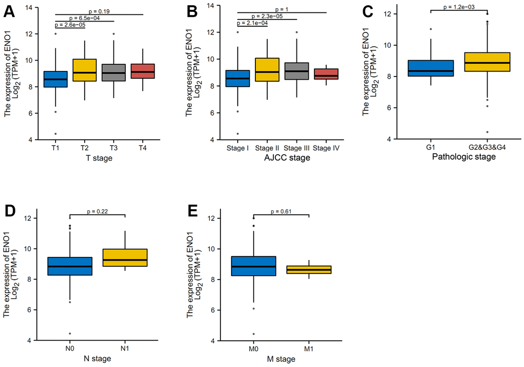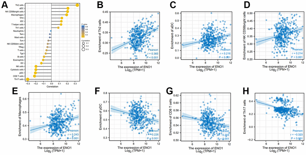 The results of the clinical correlation analysis of ENO1 gene expression suggest that ENO1 is associated with tumor size and stage. The gene was less expressed in stage T1 compared to stage T2 and T3 (Figure 6A). The expression of ENO1 increased significantly with higher tumor stage in stage (Figure 6B), and in the pathological Grade stage, the expression of ENO1 was also increased in other Grade grades compared to Grade 1 (Figure 6C). However, unfortunately, our analysis revealed that ENO1 was not associated with lymph node status or distant metastatic status (Figure 6D, 6E). Furthermore, the immune infiltration results suggested that ENO1 correlated with Th2 cells, aDC, NK CD56bright cells, macrophages, pDC, CD8 T cells and Th17 cells in the tumor microenvironment, suggesting that ENO1 may promote liver cancer progression by regulating immune infiltrating cells in the tumor microenvironment (Figure 7).