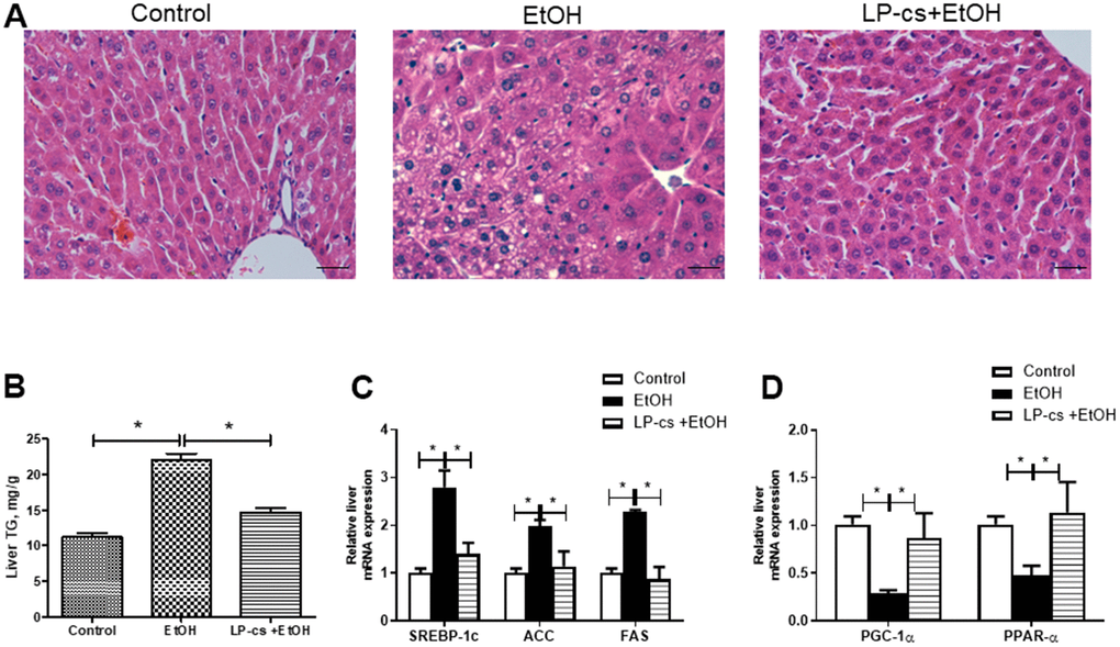 In the present study, alcohol exposure significantly increased hepatic lipid accumulation, liver injury, and hepatic apoptosis, while LP-cs pretreatment significantly prevented these changes. The protective role of LP-cs in fat accumulation might be associated with metabolism, including de novo lipogenesis and catabolism. During hepatic steatosis development, expression levels of hepatic SREBP-1c were upregulated in alcohol-treated mice, leading to increased gene expression involved in de novo lipogenesis (Figure 1C). Hepatic PGC-1α and PPAR-α gene expression were significantly decreased in alcohol-treated mice, causing fatty acid β-oxidation reduction. Pretreatment with LP-cs markedly reversed the changes in these genes induced by alcohol exposure (Figure 1D).