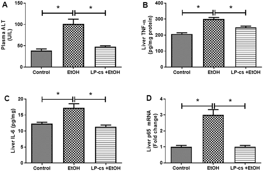 Inflammation is a hallmark of ALD. The hepatic pro-inflammatory cytokines, TNF-α, and IL-6 were markedly increased in binge alcohol exposure, an effect that was decreased by LP-cs pretreatment (Figure 2B, 2C). Similarly, the expression level of the hepatic p65 gene was enhanced by alcohol exposure, an effect that was inhibited by LP-cs pretreatment (Figure 2D). These findings suggest that alcohol-induced hepatic inflammation is reduced by LP-cs pretreatment.