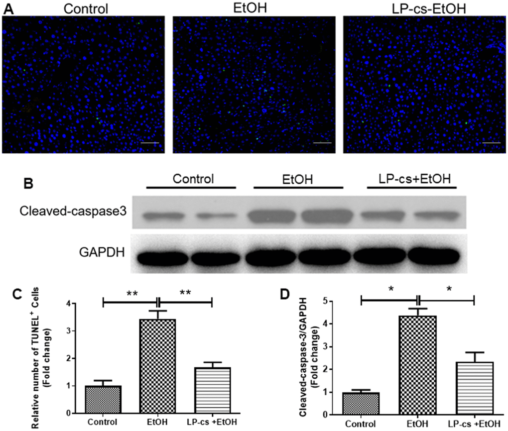 Hepatic apoptosis was determined by TUNEL assay. The relative number of TUNEL+ cells was more significant in alcohol-treated mice than in controls, and this phenomenon was reversed by LP-cs pretreatment (Figure 3A, 3C). In addition, alcohol-treated cells exhibited a more significant number of apoptotic cells than control cells. The amount of cleaved caspase-3 was increased more than four-fold by alcohol treatment. Pretreatment with LP-cs markedly reversed these changes induced by alcohol exposure (Figure 3B, 3D). These findings suggest that LP-cs pretreatment prevents = alcohol-induced hepatocyte apoptosis.