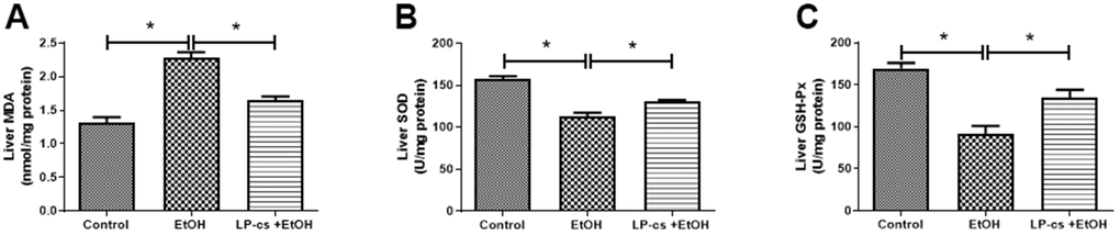 Alcohol exposure-induced oxidative stress is a significant contributor to ALD. We determined whether LP-cs would rescue the defective antioxidant system in alcohol-treated mice to ascertain the protective role in acute alcohol-induced hepatotoxicity. Compared with the control group, SOD and GSH-Px levels were significantly lower; however, MDA levels were markedly higher in the alcohol group. These effects were all reversed by LP-cs pre-treatment (Figure 4), suggesting that LP-cs inhibits acute alcohol-induced hepatic oxidative stress in vivo.