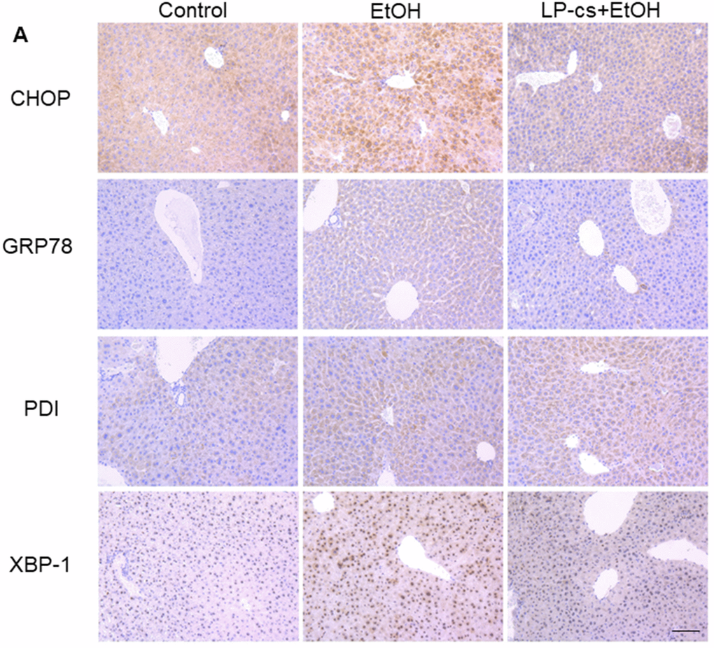 ER stress causes cellular toxicity through several signaling pathways, including apoptosis and autophagy. To assess the role of ER stress in alcohol-induced hepatotoxicity, immunohistochemistry staining was used to demonstrate the expression of the ER stress- associated proteins, including CHOP, GRP78, PDI, and XBP-1. These proteins were upregulated markedly by alcohol treatment at 6 h and were significantly downregulated by LP-cs pretreatment (Figure 5A), suggesting that pretreatment with LP-cs prevents acute alcohol-induced hepatotoxicity by inhibiting ER stress.