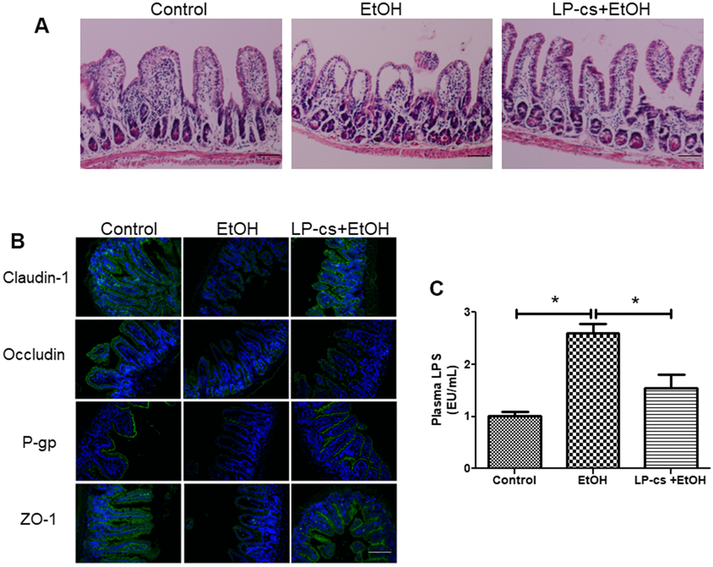Alcohol leads to quantitative and qualitative gut flora alterations, mucosal damage, and gut permeability enhancement, resulting in the translocation of bacterial products and endotoxins into portal blood flow [7]. Bacterial products stimulate the production of pro-inflammatory mediators, including ROS, chemokines, cytokines, and leukotrienes, which cause inflammatory cell infiltration and liver injury, such as fibrosis [41]. In the present study, histological staining of intestine sections revealed that acute alcohol triggered structural disruption of the central lacteal and reduced the number of small intestinal folds. These injuries were significantly reversed with LP-cs pretreatment (Figure 6). Decreased expression levels of several TJ proteins (claudin-1, occludin, and ZO-1) in the intestine were reported in the experimental mouse model of ALD [42]. Oxidative stress induced by alcohol exposure significantly triggers the intestinal barrier's damage by reducing tight junctions [43]. The present study demonstrated that binge alcohol exposure downregulated intestinal tight junction protein levels, and LP-cs pretreatment reversed these changes (Figure 6). Additionally, P-gp (a 170-kDa transmembrane protein) is abundantly expressed on the apical surface of intestinal epithelial cells. Several lines suggest that P-gp protects the intestinal epithelia by mediating bacterial toxin efflux from the intestinal mucosa into the gut lumen. Dysregulated P-gp expression is associated with the pathogenesis of several gut disorders, such as inflammatory bowel disease, experimental animal models of colitis, ulcerative colitis, and Crohn’s disease. Upregulation of P-gp by two probiotic strains (Lactobacillus acidophilus and rhamnosus) has been demonstrated in a mouse model of DSS-induced colitis [42]. Our present findings suggest that binge alcohol exposure remarkably reduced P-gp expression levels. These changes were reversed by LP-cs pretreatment (Figure 6). Therefore, the protective effect against intestinal barrier dysfunction binge alcohol-induced might be achieved via a combinatorial regulation of intestinal mucin function. Furthermore, previous studies have identified that defects in intestinal barrier integrity can result in elevated plasma LPS levels in ALD models [44]. In the current study, acute alcohol exposure significantly increased plasma LPS levels, and LP-cs pretreatment significantly attenuated the rise in LPS levels (Figure 6).