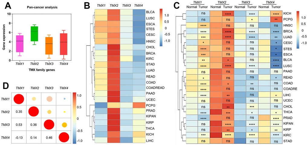 To gain insights into the expression of TMX family genes across various types of cancers, we initially evaluated their expression patterns in pan-cancer using data from the TCGA and GTEx databases (Figure 1A). Overall, the highest expression of TMX2 and the lowest expression of TMX3 was found in pan-cancer (Figure 1B). Additionally, we also examined TMX family genes expression in both tumors and adjacent or healthy tissues. The results indicated significant differences in the expression levels of TMX family genes across different types of cancer (Figure 1C). Subsequently, we also explored the association between their expression levels in different tumors by using person correlation-coefficient analysis. We observed that TMX1 and TMX3 (r = 0.53) had a high positive correlation, and TMX1 and TMX4 (r = -0.13) showed the highest negative correlation (Figure 1D). These intriguing findings imply that TMX family genes may possess interconnected biological functions and regulatory mechanisms within the context of cancers.