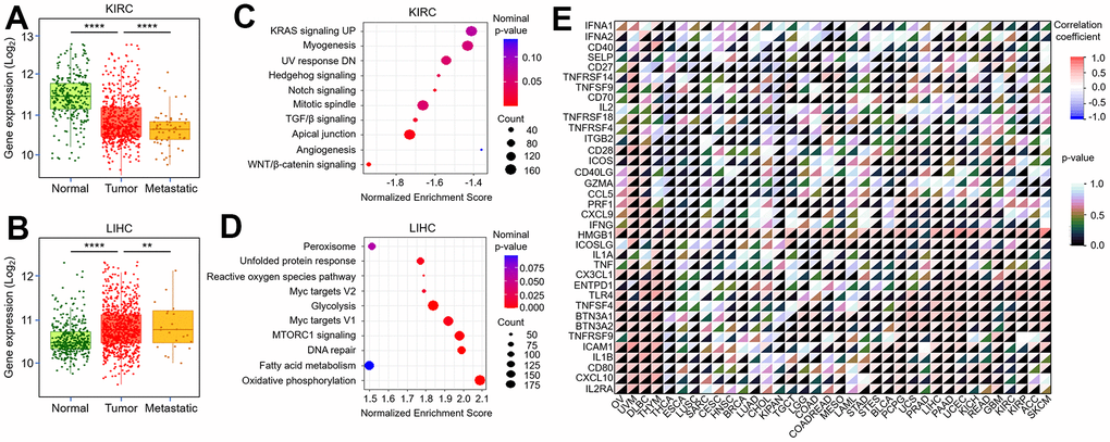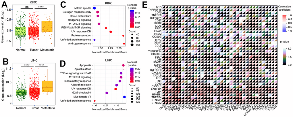 The previous results have confirmed the biological effects of TMX family genes in the tumor-microenvironment. Subsequently, we further explored the correlation of their expression with tumor metastasis. Our results found TMX2 expression was negatively correlated with KIRC metastasis (Figure 9A), and positively correlated with metastasis in LIHC (Figure 9B). We also observed TMX4 expression had a positive correlation with the metastasis of KIRC (Figure 10A) and LIHC (Figure 10B). In order to better evaluate the signaling pathways activated by TMX2 and TMX4 in KIRC and LIHC, GSEA was implemented. We revealed signaling pathways that are significantly enriched in low TMX2 expression phenotype (Figure 9C) and high TMX4 expression phenotype (Figure 9D) in KIRC, respectively. In addition, we also explored the signaling pathways that are significantly enriched in high TMX2 (Figure 10C) and TMX4 (Figure 10D) expression phenotypes in LIHC. These findings suggest that TMX2 and TMX4 may regulate the proliferation, invasion and metastasis of KIRC and LIHC through the above pathways. Furthermore, we also investigated the correlation of TMX2 and TMX4 expression with immune-checkpoint-related stimulator genes in pan-cancer. Our results demonstrated that they were positively or negatively correlated with these immune checkpoint genes (Figures 9E, 10E).