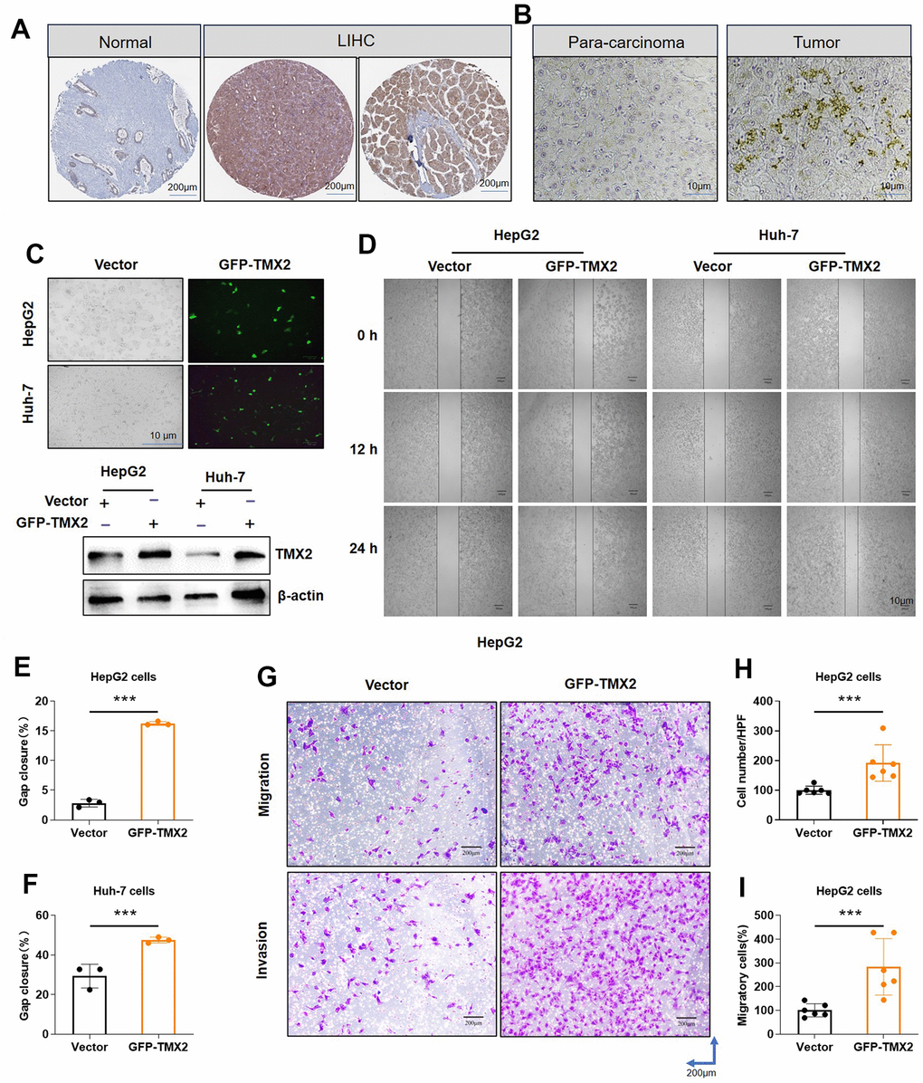 We previously found that TMX2 expression was positively correlated with the metastasis of LIHC. By analyzing the actual protein expression in human tumor tissues, we found that the TMX2 protein is more strongly expressed in tumor tissues compared to adjacent normal tissues (Figure 11A). Subsequently, we found similar results in the clinical collection of case tissues by immunohistochemical staining (Figure 11B). To further investigate the roles of TMX family members in hepatocellular carcinoma cells invasion, transfection experiments were performed. We first overexpressed TMX2 plasmid with GFP green fluorescence in HepG2 and Huh-7 cells (Figure 11C). In comparison to the control group, TMX2 overexpression caused significantly faster wound healing percentage in HepG2 (Figure 11D, 11E) and Huh-7 cells (Figure 11D, 11F). Subsequently, transwell experiment was performed to investigate the cells invasion ability. The results showed that TMX2 up-regulation promoted the migration (Figure 11G, 11H) and invasion (Figure 11G, 11I) of HepG2 cells compared to the control group.