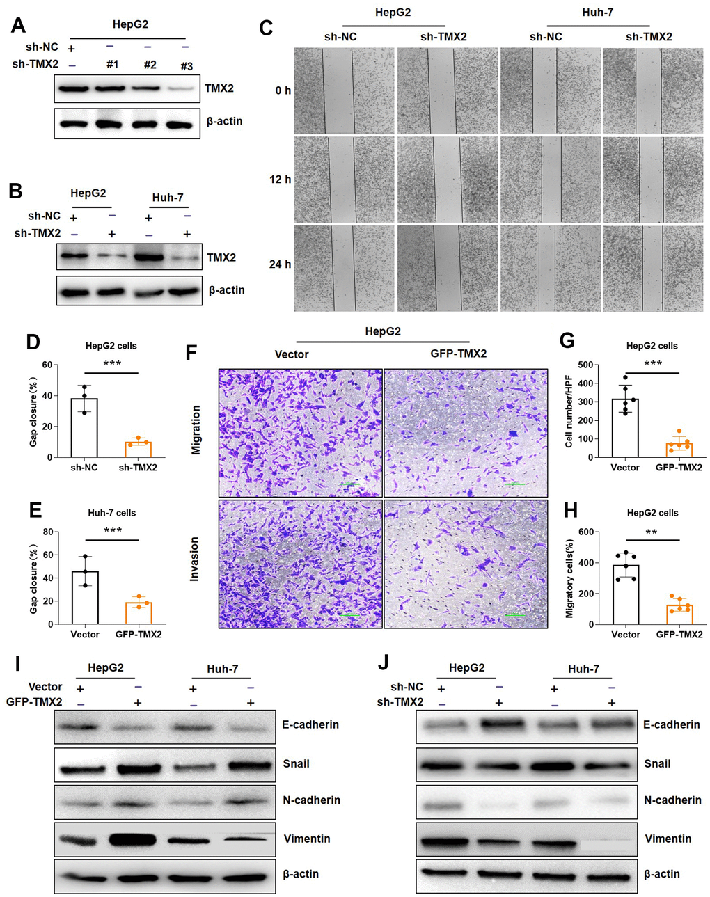 To further investigate the biological roles of TMX2 knock-down on invasion and migration of hepatoma cell lines (HepG2 and Huh-7), we also transfected shRNA plasmid targeting TMX2 into cells to knockdown endogenous TMX2. Among the different plasmids, we found that plasmid 3# had a better effect, and it was also selected for subsequent knockdown experiments. (Figure 12A, 12B). Compared with the control group, TMX2 knockdown caused significantly slower wound healing percentage in HepG2 (Figure 12C, 12D) and Huh-7 cells (Figure 12C, 12E). Similarly, TMX2 knockdown attenuated the migration (Figure 12F, 12G) and invasion (Figure 12F, 12H) of HepG2 cells. Additionally, we also found the exogenous expression of TMX2 in HepG2 and Huh-7 cells led to alterations resembling EMT. This was indicated by the decrease in levels of E-cadherin, along with increases in levels of Snail, N-cadherin, and Vimentin (Figure 12I). Conversely, silencing TMX2 in HepG2 and Huh-7 cells resulted in the opposite effects (Figure 12J).
