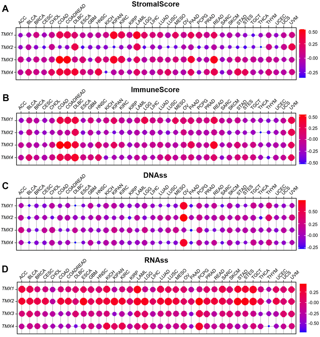 The previous results have demonstrated the prognostic significance of TMX family genes in pan-cancer. To investigate the roles of their expression in TME, the ESTIMATE algorithm was implemented, which is presented in the form of StromalScore and ImmuneScore. The higher these scores reflect the higher abundance of matrix components and immune components in the tumor microenvironment. By estimating StromalScore and ImmuneScore in TME, we found that TMX1, TMX3, and TMX4 exhibited a positive correlation with StromalScore (Figure 4A) and StromalScore (Figure 4B) in most cancer types, while TMX2 expression was negatively correlated with StromalScore (Figure 4A) and ImmuneScore (Figure 4B). Furthermore, we also have observed a negative correlation of TMX family genes expression with DNAss (Figure 4C) and a positive correlation with RNAss (Figure 4D) in some type of tumors.
