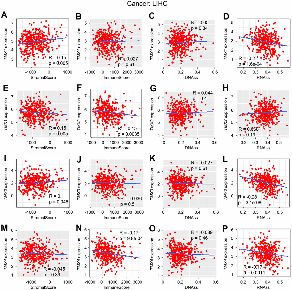 In previous research, we discovered a significant association between the expression of TMX family genes and improved overall survival in KIRC and LIHC, as confirmed by multiple databases (Table 1). Building upon this, we investigated the correlation of their expression between TME, as well as stemness score in KIRC (Figure 5) and LIHC (Figure 6). Our findings revealed that TMX1 expression was positively correlated with StromalScore in KIRC (Figure 5A). TMX2 expression was found to be inversely correlated with KIRC StromalScore (Figure 5E) and ImmuneScore (Figure 5F), and was positively correlated with RNAss (Figure 5H). In KIRC, TMX3 expression demonstrated a positive correlation with the StromalScore (Figure 5I) and a negative correlation with RNAss (Figure 5L). In contrast, TMX4 expression was negatively correlated with KIRC ImmuneScore (Figure 5N) and positively correlated with RNAss (Figure 5P). We also observed that TMX1 expression had a positive correlation with LIHC StromalScore (Figure 6A), and a negative correlation with RNAss (Figure 6D). TMX2 expression showed a negative correlation with ImmuneScore in LIHC (Figure 6F). TMX3 expression had a positive correlation with LIHC StromalScore (Figure 6J), and a negative correlation with RNAss (Figure 6L). TMX4 expression was a negative correlation with ImmuneScore (Figure 6N) and RNAss (Figure 6P) in LIHC. Taking together, we observed that TMX family genes expression was related to the composition of the immune-microenvironment and tumor stemness in some types of tumors, especially in KIRC and LIHC.