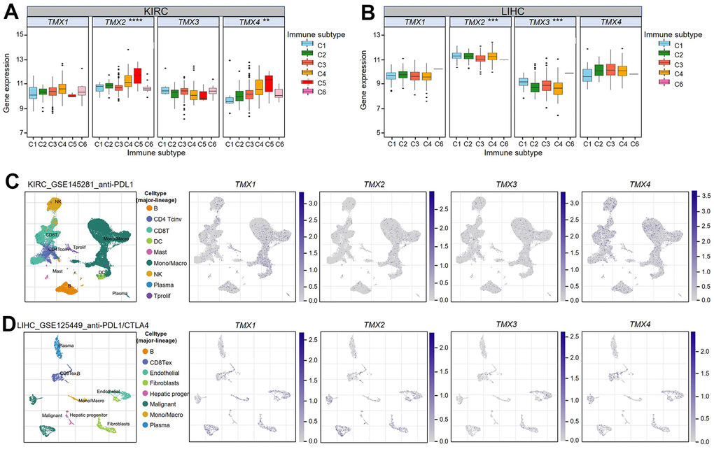 Previous studies have classified human tumors into six different types of immune infiltration, including C1 (wound healing), C2 (IFN-g dominance), C3 (inflammation), C4 (lymphocyte depletion), C5 (immunologically quiet), and C6 (TGF-β dominant), and the degree of cytotoxicity increases gradually from C1 to C6 [17]. The tumor immunophenotype is a key predictor of its response to immunotherapy, and low cytotoxic immunophenotype promotes tumor development. With this in mind, we classified the tumor samples in TCGA data according to immune infiltration subtype, and subsequently analyzed their correlation with TMX family genes expression. Our analysis revealed that there are significant correlations between TMX2 and TMX4 with the immune subtypes of KIRC (Figure 7). In KIRC, TNS2 expression was higher in C5 and TMX4 expression was lower in C1 (Figure 7A). In addition, the immune subtypes of LIHC (liver hepatocellular carcinoma) showed significant associations with TMX2 and TMX3 (Figure 8). Specifically, the expression of TMX2 was higher in C4, and TMX3 expression was lower in C4 (Figure 7B). To explore the possible mechanism of TMX family genes affecting TME, the single-cell RNA-seq (scRNA) sequencing was performed. We found they were mainly expressed in monocytes/macrophages, especially in KIRC (Figure 7C) and LIHC (Figure 7D). These results suggest that TMX family genes may play important roles in immune regulation.