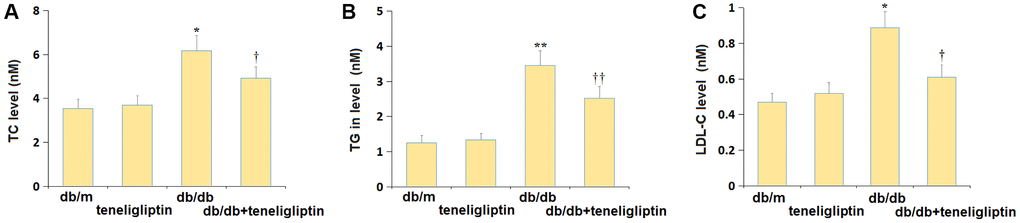 Firstly, the biochemical indexes were detected following administration. The TC level was maintained around 3.6 mM in the db/m and db/m+ teneligliptin groups and was signally increased to 6.18 mM in the db/db group, then markedly reduced to 4.92 mM by teneligliptin (Figure 1A). Furthermore, the TG levels in the db/m, db/m+ teneligliptin, db/db, and db/db+ teneligliptin groups were 1.25, 1.33, 3.46, and 2.52 mM, respectively (Figure 1B). Moreover, the LDL-C level was slightly altered in the db/m+ teneligliptin group and notably elevated in the db/db group but was dramatically declined in the db/db+ teneligliptin group (Figure 1C).