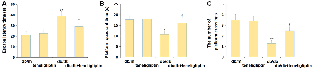 The escape latency to reach the escape platform in the db/m, db/m+ teneligliptin, db/db, and db/db+ teneligliptin groups was 21.4, 22.7, 38.9, and 29.3 s, respectively (Figure 2A). The time spent in the platform (Figure 2B) was kept around 18.0 s in the db/m and db/m+ teneligliptin groups, and was markedly reduced to 10.8 s in diabetic mice, then signally increased to 16.2 s by teneligliptin. Furthermore, the average number of platform crossings in the db/m, db/m+ teneligliptin, db/db, and db/db+ teneligliptin groups was 3.5, 3.4, 1.3, and 2.5, respectively (Figure 2C).