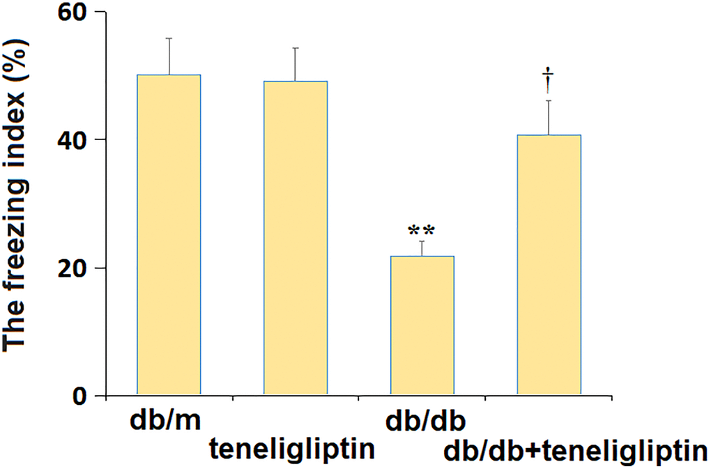 Subsequently, the behavior change in diabetic mice was confirmed using the fear conditioning test. The freezing index was minorly changed from 50.1% to 49.2% in the db/m+ teneligliptin group and largely decreased to 21.8% in the db/db group, then greatly reversed to 40.7% by teneligliptin (Figure 3).