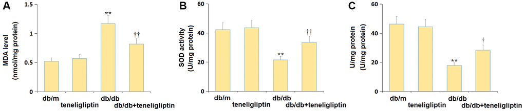 12 non-diabetic (db/m) and 12 db/db mice (7–9 weeks) were obtained from the Vital River (China). After one week of adaptive feeding, db/m mice and db/db mice were orally administered with teneligliptin (60 mg/kg/day) for 10 weeks. The mice were divided into four groups: db/m, db/m+ teneligliptin, db/db, and db/db+ teneligliptin.