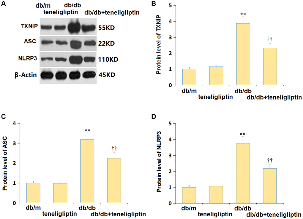 NLRP3 signaling has a claimed correlation to the development of diabetes-related CI [23]. Herein, the mildly altered TXNIP, ASC, and NLRP3 levels in the db/m+ teneligliptin group were markedly promoted in diabetic mice, and then signally repressed by teneligliptin (Figure 7A–7D).