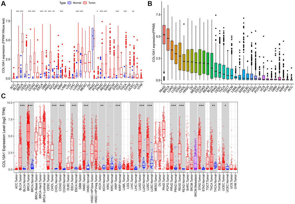 In this study, we jointly analyzed the expression level of COL10A1 in pan-cancer using R software as well as online databases. Our team demonstrated that COL10A1 expression was strongly different between most cancers and normal tissues. Its expression was markedly upregulated in BLCA, BRCA, CHOL, COAD, ESCA, HNSC, LUAD, LUSC, PCPG, PRAD, READ, STAD, THCA and UCEC in comparison to normal tissues. Our findings were further supported by the TIMER database.