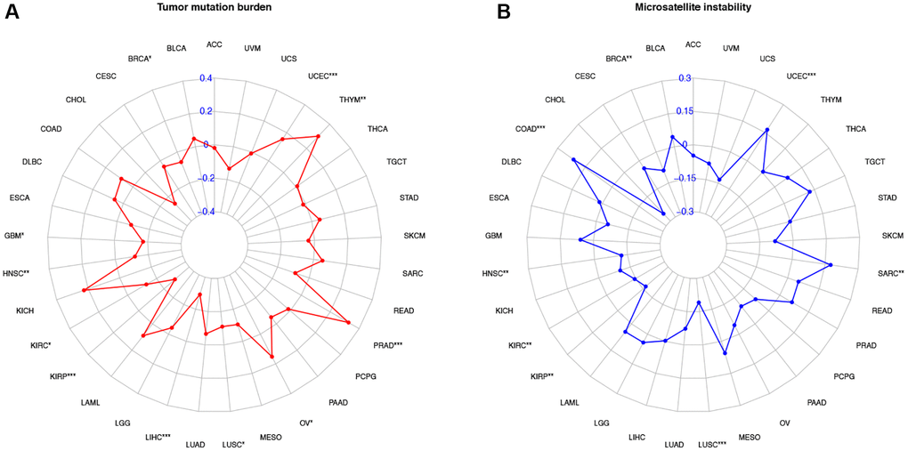 In this study, COL10A1 was identified as being correlated with TMB and MSI in cancers. In OV, PRAD, THYM and UCEC, the expression of COL10A1 was positively associated with TMB, indicating that the higher expression of COL10A1 was associated with a higher mutation in the above tumors. In COAD, SARC and UCEC, the expression of COL10A1 was positively associated with MSI. In contrast, in BRCA, HNSC, KIRC, KIRP and LUSC, COL10A1 expression level was significantly negatively associated with both TMB and MSI.