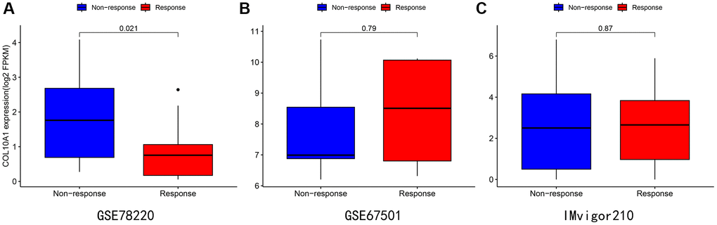 Overall, immunotherapy can produce four results: complete remission, partial remission, disease progression, and disease stabilization. In our study, people who showed complete or partial remission were classified as responders and compared with non-responders who demonstrated evidence of disease progression or stabilization. Finally, three datasets, GSE78220, GSE67501 and IMvigor210, were selected to compare the variation in COL10A1 gene levels between patients in the responder and non-responder groups after immunotherapy. The data for all three sets of data were obtained from the Gene Expression Omnibus (GEO) database [42–44]. The R package “limma”, “ggplot2” and “ggpubr” were used to plot box plots for the three treatment groups and to give p-values for comparisons between groups.