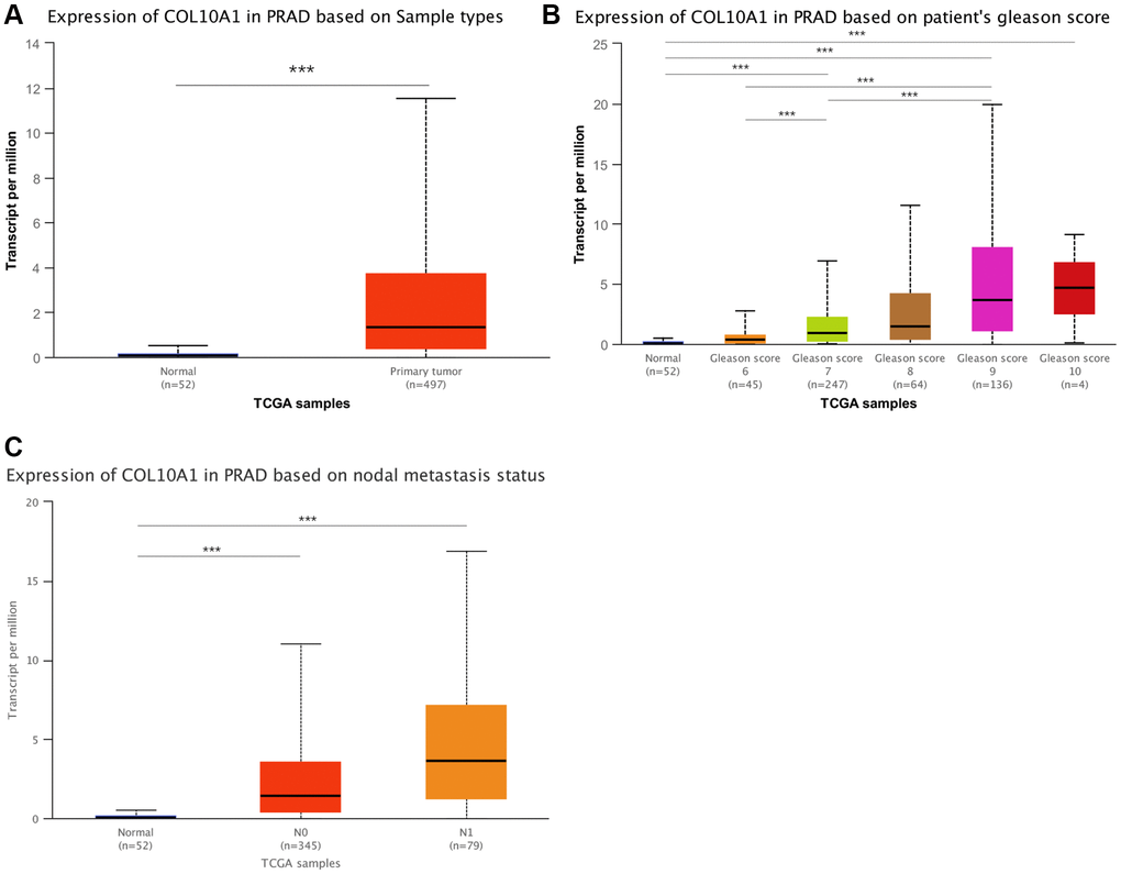 In the above analysis, it was found that COL10A1 expression associated with the clinical features and prognosis of a variety of cancer types, and our team also found relationships between COL10A1 expression and immune cell infiltration, TMB and MSI. These were all highly associated with PRAD. Subsequently, the clinical features of high COL10A1 expression and PRAD were then further investigated using the UALCAN database. Figure 12A showed the results of COL10A1 expression in PRAD. Significantly, the aberrant expression of COL10A1 in PRAD was closely associated with the Gleason score. Higher COL10A1 expression corresponded to higher Gleason scores (Figure 12B). In addition, overexpression of COL10A1 in PRAD was closely associated with nodal metastasis (Figure 12C). All these studies indicated that COL10A1 is a key player in the pathogenesis of PRAD.