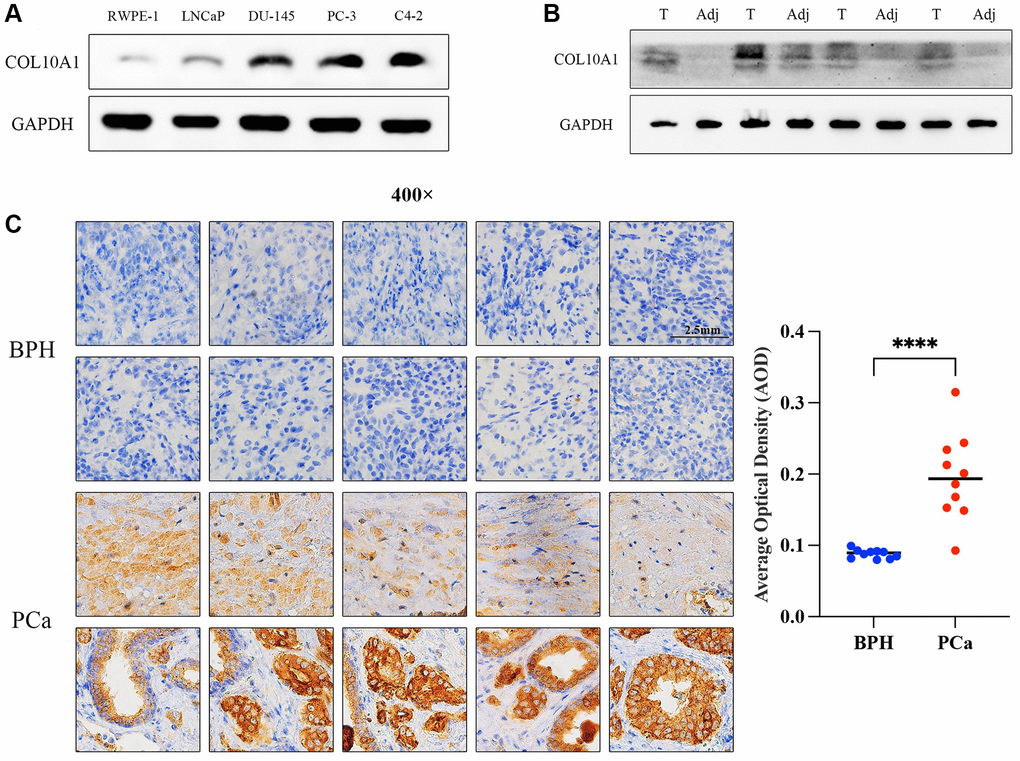 To discover the expression level of COL10A1 in normal prostate cells and prostate cancer cells, the expression level of COL10A1 was preliminarily discussed in GEO database GSE60329 (Supplementary Figure 7). Western Blot was performed in the RWPE-1, LNCaP, DU-145, PC-3 and C4-2 cell lines. It was revealed that at the protein level, except for LNCap, the expression of COL10A1 in the other three prostate cancer cell lines were markedly upregulated compared to RWPE-1 (normal prostate cells) (Figure 13A). Additionally, the expression level of COL10A1 in 4 pairs of prostate cancer tissues and adjacent tissues was observed via Western Blot. The expression level of COL10A1 was markedly higher in prostate cancer tissues compared to adjacent tissues (Figure 13B). We performed immunohistochemistry staining (IHC) for COL10A1 on 10 pairs of prostate cancer patient and benign prostate hyperplasia (BPH) tissues specimens. The outcomes indicated that COL10A1 was expressed at a much higher level in the prostate cancer samples than it was in the BPH tissues (Figure 13C). In summary, the findings demonstrated the overexpression of COL10A1 in prostate cancer, corroborating the observations from the bioinformatic analysis and providing a foundation for subsequent experiments.