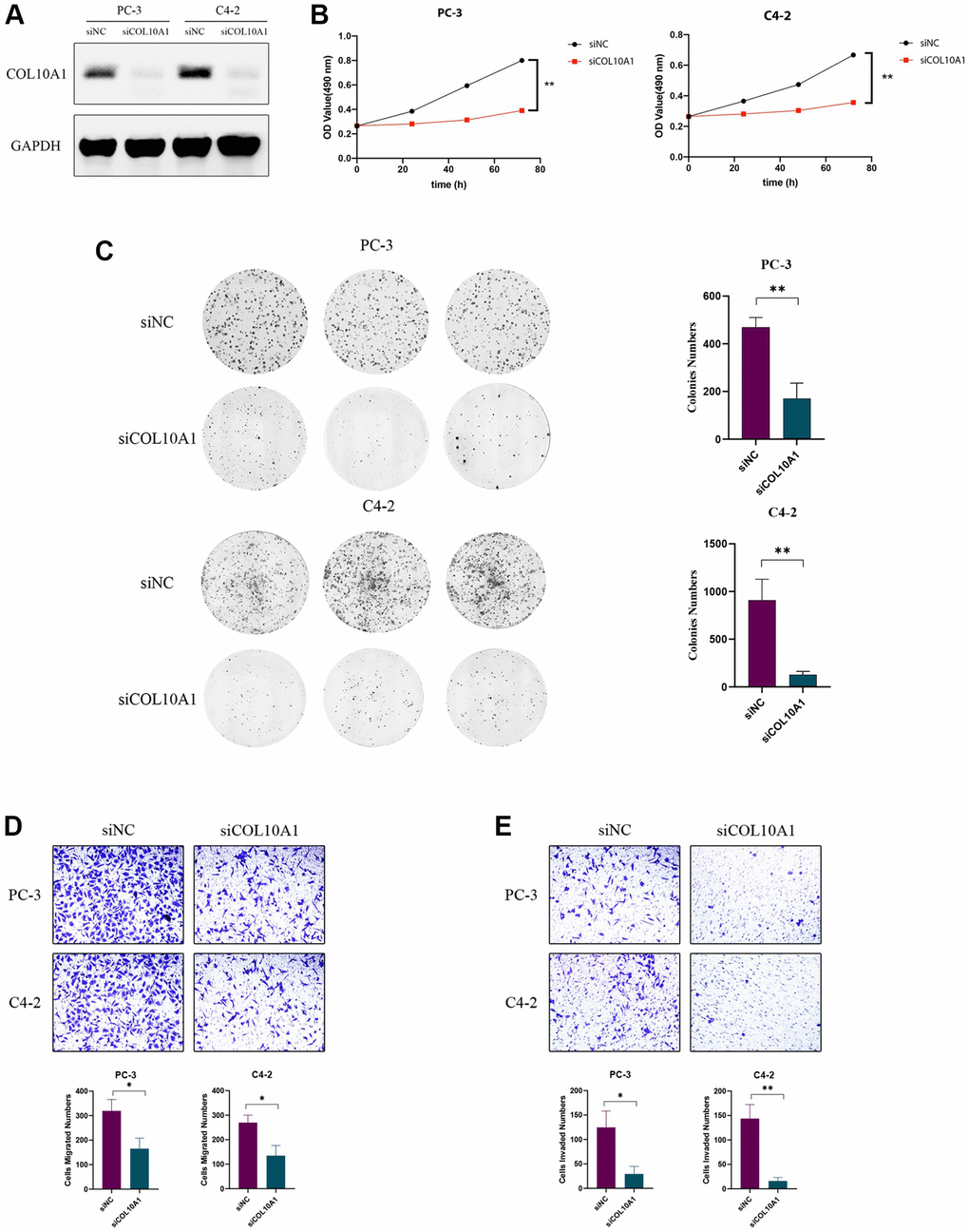 To investigate the impact of COL10A1 on cancer cells, PC-3 and C4-2 cells were transduced with COL10A1 siRNA. The Western Blot assay result indicated that the protein level of COL10A1 was significantly downregulated in cells transduced with si-COL10A1 in comparison to those transduced with siNC (Figure 14A). The CCK-8 and colony formation experiments demonstrated that the targeted knockdown of COL10A1 inhibited the proliferation of PC3 and C4-2 cells to a greater extent than the cells transduced with siNC (Figure 14B, 14C). Likewise, knockdown of COL10A1 markedly blocked the migration of PC-3 and C4-2 cells in the transwell migration experiment (Figure 14D). Moreover, downregulation of COL10A1 remarkably reduced the invasive ability of PC-3 and C4-2 cells as in comparison to those transduced by siNC (Figure 14E). Together, these findings suggested that attenuating the COL10A1 can greatly suppress the aggressiveness of prostate cancer cells.