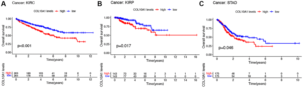 To observe the impact of COL10A1 on the prognosis of patients with different cancer types, Kaplan-Meier plotter was employed. It showed that COL10A1 overexpression was significantly associated with poorer OS in patients with BLCA, BRCA, KIRC, KIRP, LIHC, UCEC, SARC, while it remains the opposite for patients with THYM (Supplementary Figure 3).