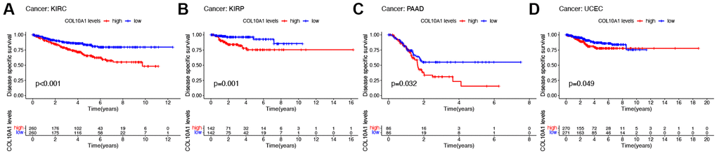 High COL10A1 expression correlated with shorter DSS in KIRC, KIRP, PAAD and UCEC in Kaplan-Meier survival curves (Figure 3A–3D). According to the cox regression outcomes, increased COL10A1 levels were correlated with shorter DSS in GBM (p = 0.017, HR = 1.423), KIRC (p = 1.27E-05, HR = 1.495), KIRP (p = 6.70E-12, HR = 4.986), PAAD (p = 0.004, HR = 1.226) and UCEC (p = 0.014, HR = 1.373) (Supplementary Figure 2B).