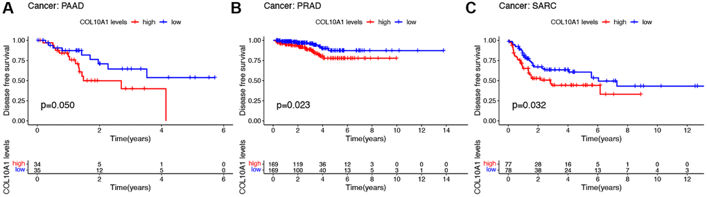 In terms of DFS, high level of COL10A1 expression correlated with poorer DFS in a large number of PAAD, PRAD, and SARC patients (Figure 4A–4C). Cox regression analysis showed that COL10A1 was a risk factor in CESC (p = 0.003, HR = 1.463), ESCA (p = 0.023, HR = 1.295), KIRP (p = 0.002, HR = 2.671), PAAD (p = 0.008, HR = 1.446) and STAD (p = 0.021, HR = 1.254), while it was a beneficial role in UCEC (p = 0.044, HR = 0.562) (Supplementary Figure 2C).